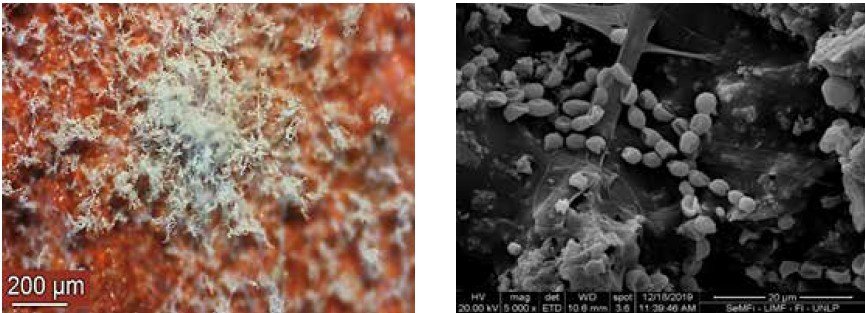 Los hongos filamentosos se describen frecuentemente como agentes de deterioro de los materiales de construcción, tanto en ambientes interiores como exteriores. Debido a su modo de nutrición, a la secreción de ácidos y enzimas extracelulares que digieren moléculas complejas y al crecimiento invasivo de las hifas, los hongos filamentosos tienen una gran capacidad para crecer en superficies de diversos materiales. Entonces posiblemente, la supervivencia y proliferación de los hongos sobre los materiales está relacionada con la capacidad de formar biopelículas.