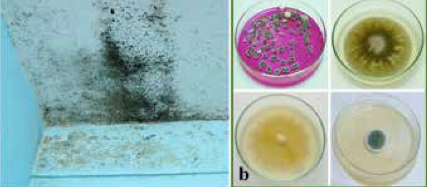 Las pinturas acrílicas hogareñas o de obra son un blanco favorable para el crecimiento de los microorganismos, debido a los componentes orgánicos en su composición y el uso de agua como solvente. Frecuentemente hongos, cianobacterias y algas causan el deterioro de las estructuras pintadas en el exterior mientras que en recubrimientos de interior el predominio lo tienen los hongos filamentosos, en la Figura 2a se puede observar un ejemplo de esto. En el área de Recubrimienos antimicrobianos del CIDEPINT se ha podido aislar e identificar distintos hongos filamentosos a partir de películas de pintura biodeterioradas para su uso como bioindicadores: Alternaria alternata (KU936229), Aspergillus fumigatus (KU936230), Chaetomium globosum (KU936228) y Penicillum commune (KU936231), entre otros. Algunos de los aislados se muestran en la Figura 2b.