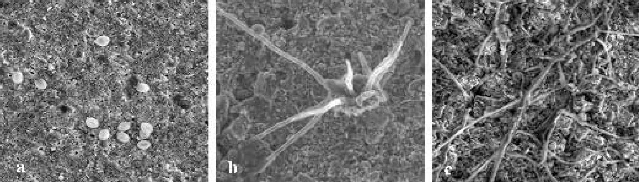 Figura 3. Imágenes obtenidas mediante MEB de muestras de pintura inoculadas con el hongo C. globosum, luego de cuatro semanas a 28°C. Magnificación 800x a) y 1500x b) y c).