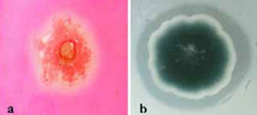 Figura 4: a) Test positivo de actividad celulolítica: halo de degradación en cultivo de Chaetomium globosum evidenciado mediante colorante rojo congo en medio de cultivo suplementado con celulosa; b) test positivo de liberación de ácidos: halo de degradación en cultivo de Penicillium commune en medio suplementado con carbonato de calcio.