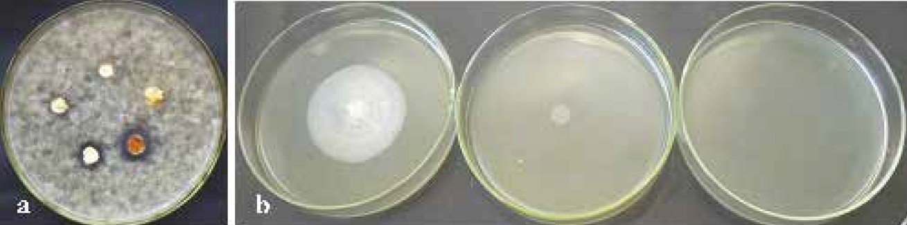 Figura 5. a) Ensayo de difusión en agar: evaluación de la actividad antifúngica de potenciales biocidas.Ejemplo de montmorillonitas modificadas frente a A. alternata. b) Ensayo de macrodilución en placa determinación de la concentración inhibitoria mínima, ejemplo de cultivos de C. globosum expuestos a distintas concentraciones de un compuesto biogénico en estudio.