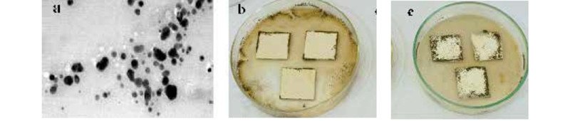 Figura 6   a) Micrografía TEM (magnificación 450000x) de Ag NPs (tamaño promedio 16 nm) obtenidas por síntesis verde. Determinación de la resistencia al crecimiento fúngico en recubrimientos: b) muetras de pinturas con AgNPs obtenidas a partir de extracto acuoso de laurel y c) control sin biocida inoculadas con C. globosum luego de cuatro semanas a 28ºC.