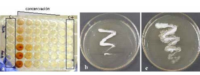 Figura 7   a) Ensayo de microdilución: determinación de la concentración inhibitoria mínima: distintas concentraciones de dos AgNPs obtenidas por síntesis verde a partir de dos extractos vegetales frente a E. coli; b y c) determinación de la resistencia de las pinturas en emulsión al crecimiento bacteriano: b) estría de una pintura no contaminada y c) de una pintura con signos de “contaminación intensa” (colonias no distinguibles) por parte de Pseudomona aeruginosa, luego 24 horas a 30°C.