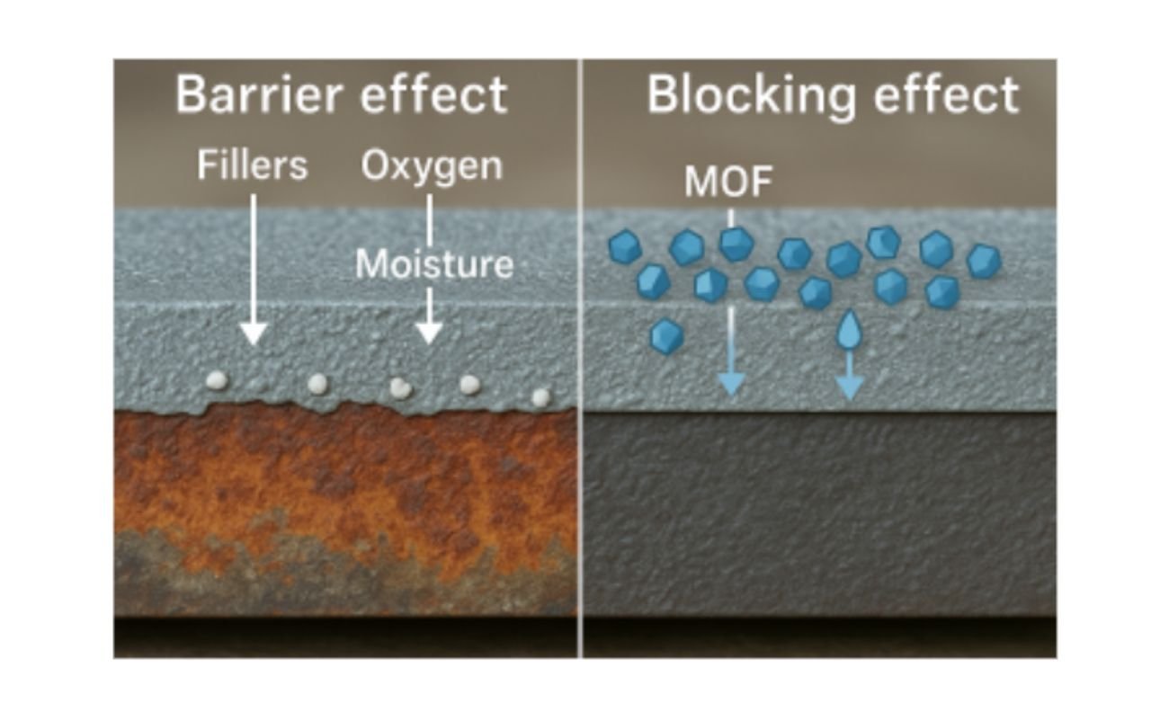 El uso de pigmentos anticorrosivos (fosfato de zinc) y cargas de “efecto barrera” (mica, talco, etc.) se vería superado incluyendo en las formulaciones de pinturas aditivos a base de MOF capaces de bloquear (“efecto bloqueador”) los elementos que afectan a la corrosión de las superficies metálicas como el oxígeno, la humedad y los contaminantes .